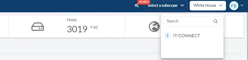 Un seul accès à la console Sweepatic pourra vous permettre de surveiller la surface d'attaque externe de plusieurs organisations. Chaque environnement est cloisonné (sur le principe d'un tenant) et vous pouvez basculer de l'un à l'autre grâce au menu situé en haut à droite de l'interface.