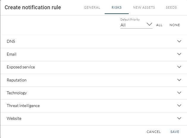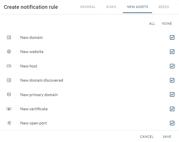Vous pouvez créer plusieurs règles de notifications et chaque règle peut envoyer ses notifications vers un ou plusieurs canal de communication différents. Sweepatic peut vous notifier quand un nouvel asset est détecté (un nouveau domaine, un nouveau port ouvert, etc.) ou quand un nouveau risque est détecté (un nouveau service exposé, par exemple).