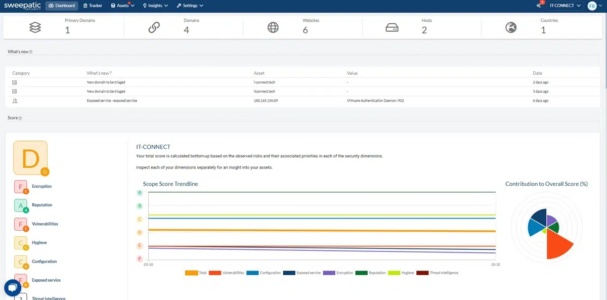 Tout en haut, nous avons un résumé sur le nom de domaine principal, le nombre de domaines surveillés, le nombre de sites web, le nombre d'hôtes et le nombre de pays (selon la géolocalisation des adresses IP). Ceci est suivi par une section baptisée "What's new" qui vous indique les derniers changements détectés sur votre surface d'attaque, tel un fil d'actualité. C'est très pratique pour visualiser les derniers événements et voir la tendance actuelle que suit votre surface d'attaque externe. En principe, l'utilisation de Sweepatic doit vous permettre d'améliorer la situation.