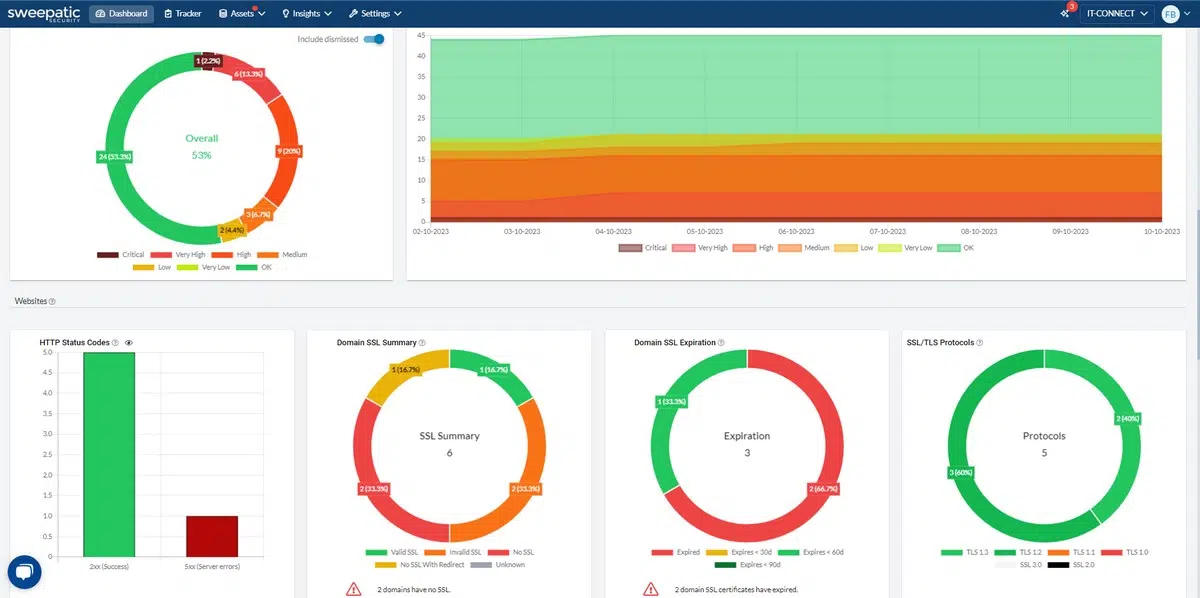 Au-delà d'être très joli, le tableau de bord Sweepatic accessible via le menu "Dashboard" donne une vue d'ensemble de sa surface d'attaque externe avec un ensemble de widgets et de graphes.