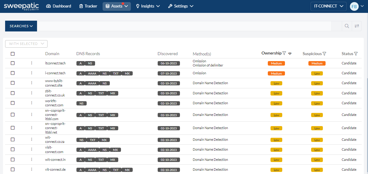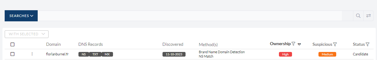 Cette analyse sera effectuée régulièrement par le moteur de découverte Sweepatic et les résultats contiennent un ensemble de caractéristiques sur les noms de domaine, dont les types d'enregistrements DNS présents dans la zone, la date de découverte et la ou les méthodes de découverte correspondantes. Les résultats intègrent aussi deux colonnes très importantes : Ownership et Suspicious, qui permettent de voir facilement quels sont les domaines ayant le plus de chance de vous appartenir ou d'être malveillant.