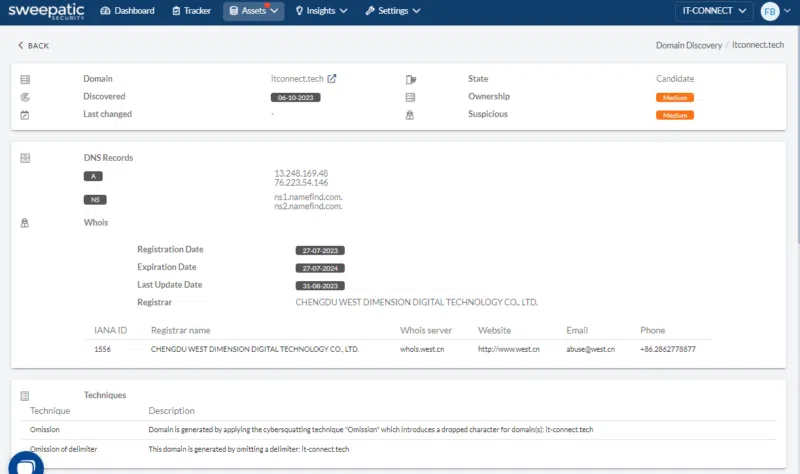 Nous pouvons constater que Sweepatic estime que le domaine "itconnect.tech" est suspect car il est proche de mon domaine principal "it-connect.tech". Il est vrai que c'est suspect que ce domaine soit enregistré, d'autant plus que je n'en suis pas le propriétaire.