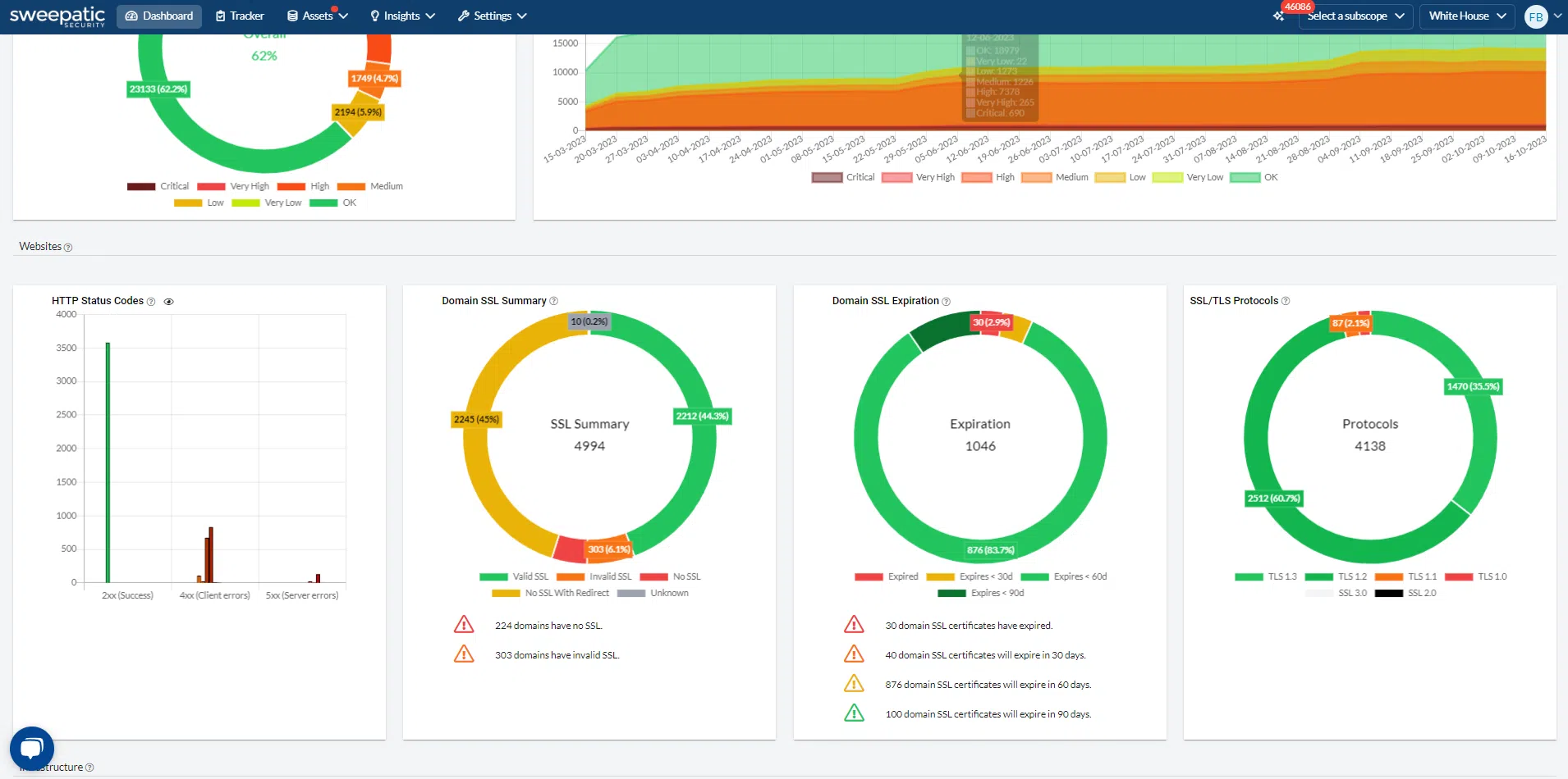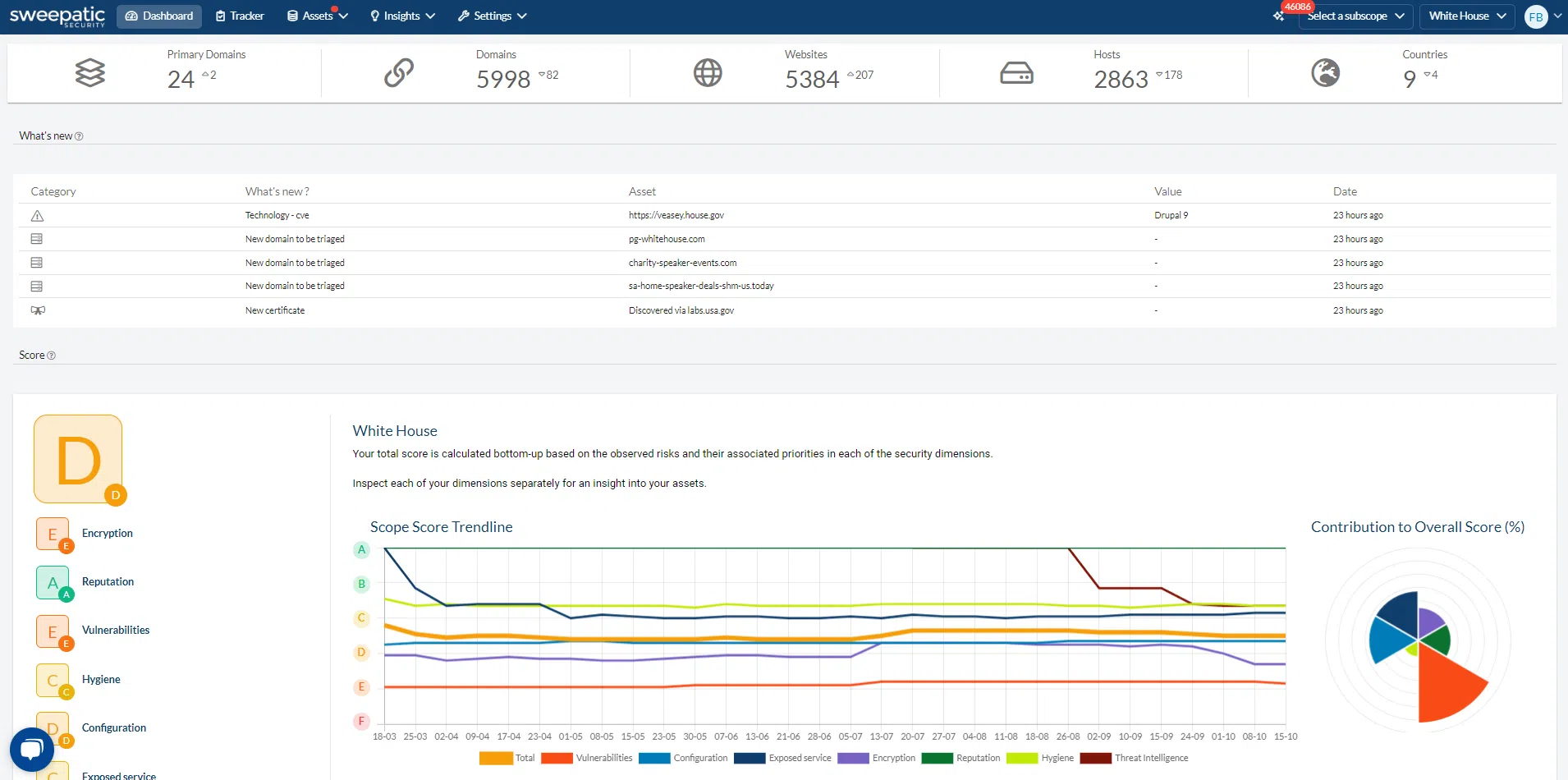 Sachez que Sweepatic est une solution adaptée pour les très grandes organisations avec plusieurs milliers de domaines et d'hôtes répartis dans plusieurs pays du monde, et elle permet également aux TPE et PME de mettre en œuvre facilement une politique de prévention aux cyber-risques de leur surface globale exposée. La Autrement dit, la solution Sweepatic peut être utilisée peu importe la taille de l'organisation. Voici un exemple avec l'analyse de la surface d'attaque externe de la Maison-Blanche :
