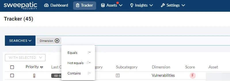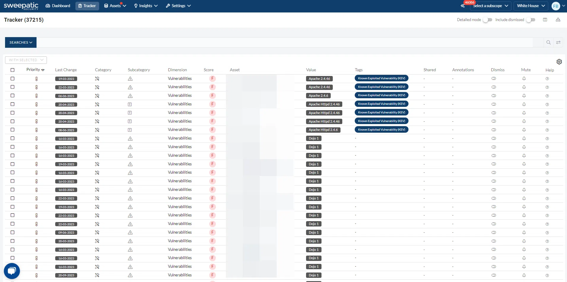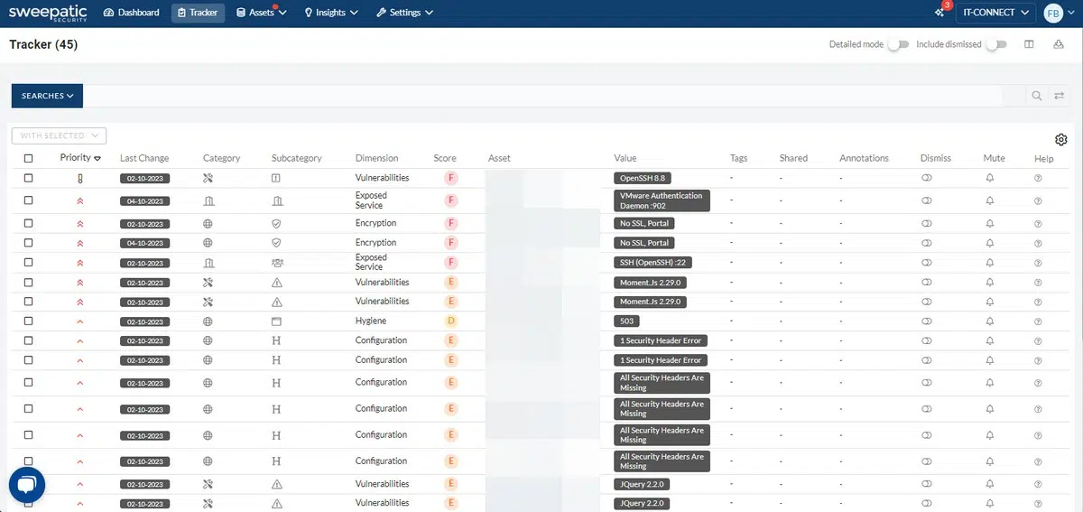 Le "Tracker" de Sweepatic liste tous les événements associés à votre surface d'attaque externe. Cette liste d'événements, qui retrace l'historique des événements, est très intéressante pour effectuer une recherche rapide sur une dimension, un produit, une CVE, etc... Mais également pour identifier les faiblesses à corriger en priorité.