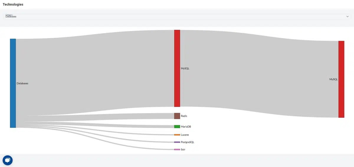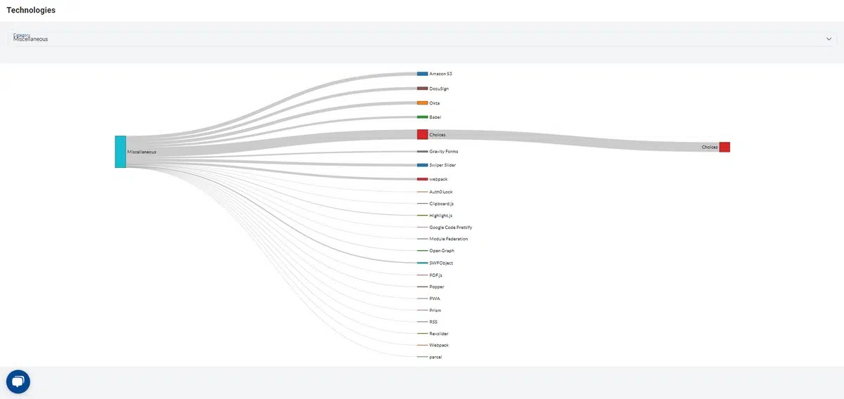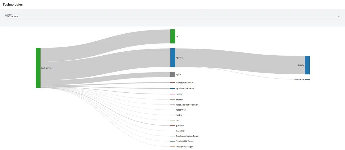 La section "Technologies" sous Insights vous donne des statistiques sur les technologies les plus utilisées par vos assets, avec un classement par catégorie : serveur web (IIS, Aapche, Nginx, etc.), CMS (WordPress, Drupal, etc.), système de gestion de bases de données (MySQL, MariaDB, PostgreSQL, Redis, etc.), service d'envoi d'e-mails (Microsoft 365, Sendgrid, Amazon SES, MailChimp, etc.), service d'authentification (Okta, Facebook Login, etc.), etc... ainsi que les services un peu exotique regroupés dans la catégorie "Miscellaneous". Il y a plusieurs dizaines de catégories. Quand l'information est disponible, chaque technologie est découpé par version.