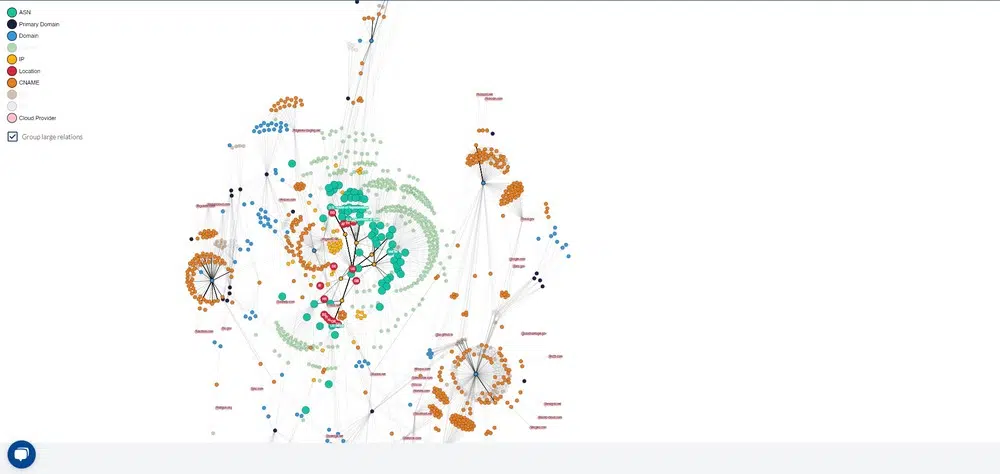 Par ailleurs, la vue "Network" sous Insights permet de visualiser les relations entre vos différents assets. Cette vue se présente sous la forme d'une carte interactive (les éléments sont cliquables et des informations s'affichent au survol de la souris). Ceci est utile pour identifier les potentiels chemins d'attaques.