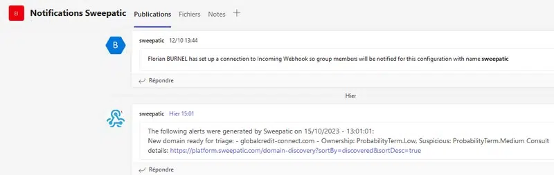 Si nous prenons l'exemple de Microsoft Teams, l'intégration est très simple et ne nécessite que quelques clics : il suffit d'ajouter un connecteur "Webhook entrant" sur le canal Teams au sein duquel vous souhaitez recevoir les notifications Sweepatic.