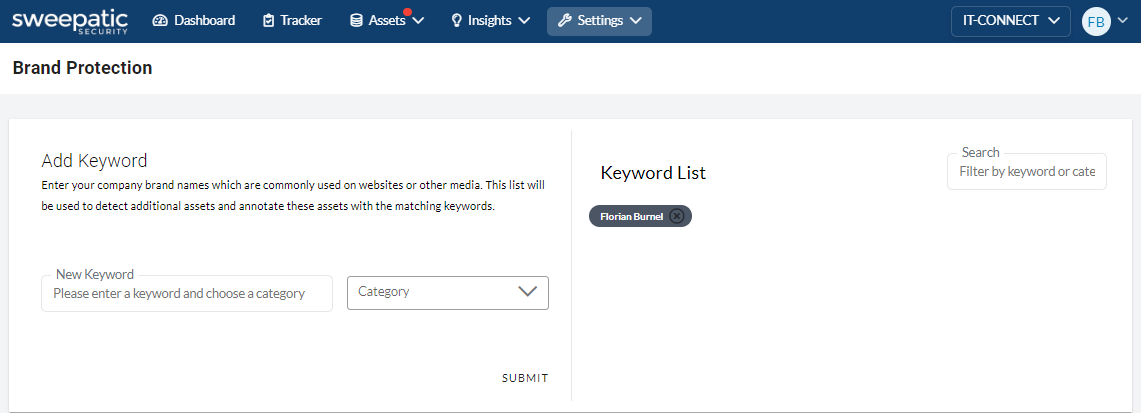 Sweepatic intègre également une fonctionnalité nommée "Brand protection" permettant de déclarer des mots clés associés à votre entreprise, à votre marque. Ceci permet d'élargir de façon pertinente la découverte des noms de domaine. Si l'on prend l'exemple d'IT-Connect, il peut s'avérer pertinent d'indiquer mon identité puisqu'elle est liée à IT-Connect. Si l'analyse portait sur la surface d'attaque externe de la France, nous pourrions intégrer "Emmanuel Macron" parmi les mots clés.