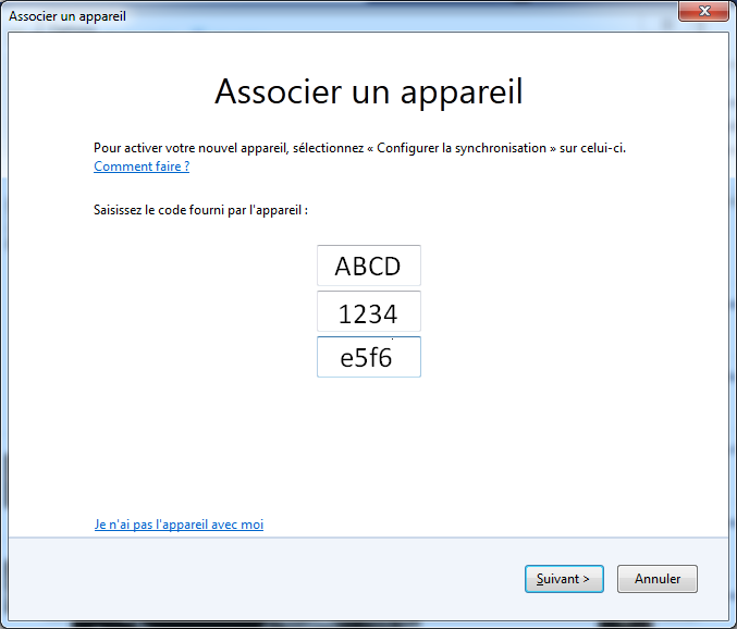 - Saisissez le code obtenu sur le second ordinateur puis cliquez sur "Suivant" :