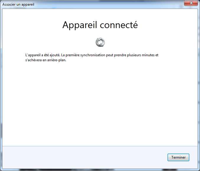 - Les deux appareils sont désormais connectés et la synchronisation s'effectue :