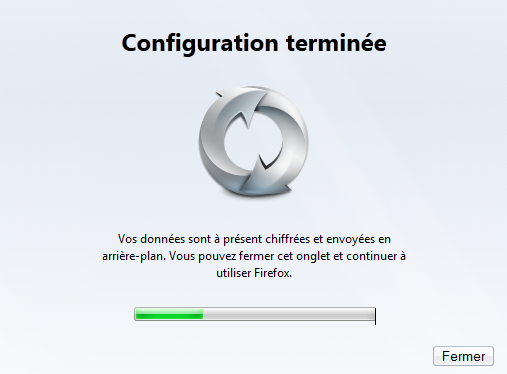 Lorsque vous avez créé votre compte, la synchronisation s'exécute en arrière plan. Les données de votre Firefox sont envoyées sur votre compte Firefox Sync tout en étant chiffrées pour garder la confidentialité.