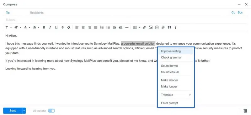 La solution de messagerie Synology MailPlus, avec la version 3.4 Beta, s’enrichit de trois fonctionnalités dopées à l’IA : AI Summary, Smart Draft et Smart Reply. Avec ces fonctionnalités, Synology veut se mettre au niveau des clients de messagerie qui ont déjà adopté l'IA.
