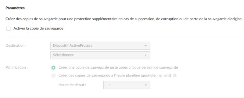 Dans le cas où votre infrastructure ActiveProtect est constituée de plusieurs serveurs appliances, cette option est utilisable. Ce n'est pas le seul scénario possible puisque la copie de sauvegarde peut être effectuée vers un espace de stockage Cloud (ou distant), notamment vers :