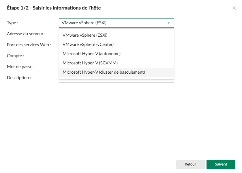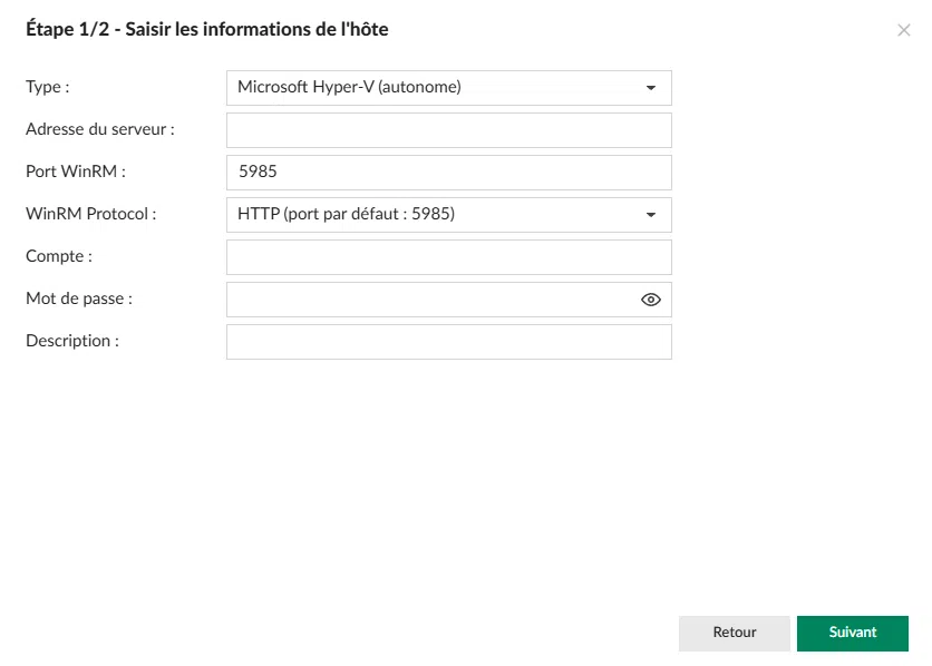 L'intégration d'un hyperviseur Hyper-V à la solution ActiveProtect nécessite la même configuration que lors de l'utilisation de la suite Active Backup (voir ce tutoriel). Il est envisageable d'ajouter un serveur Hyper-V autonome, un cluster Hyper-V ou de passer par la solution SCVMM de Microsoft. La connexion entre l'appliance et Hyper-V est établie par l'intermédiaire du protocole de gestion à distance WinRM.