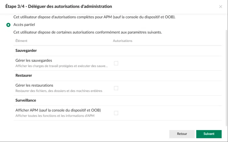 Au-delà de pouvoir connecter l'appliance à un service de gestion des identités tierces (Active Directory, par exemple), vous pouvez créer des utilisateurs locaux et des groupes de sécurité. Pour chaque groupe, vous pouvez définir des permissions fines allant de l'administrateur de la solution au simple superviseur.