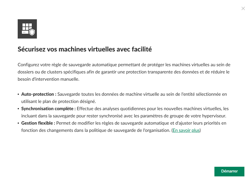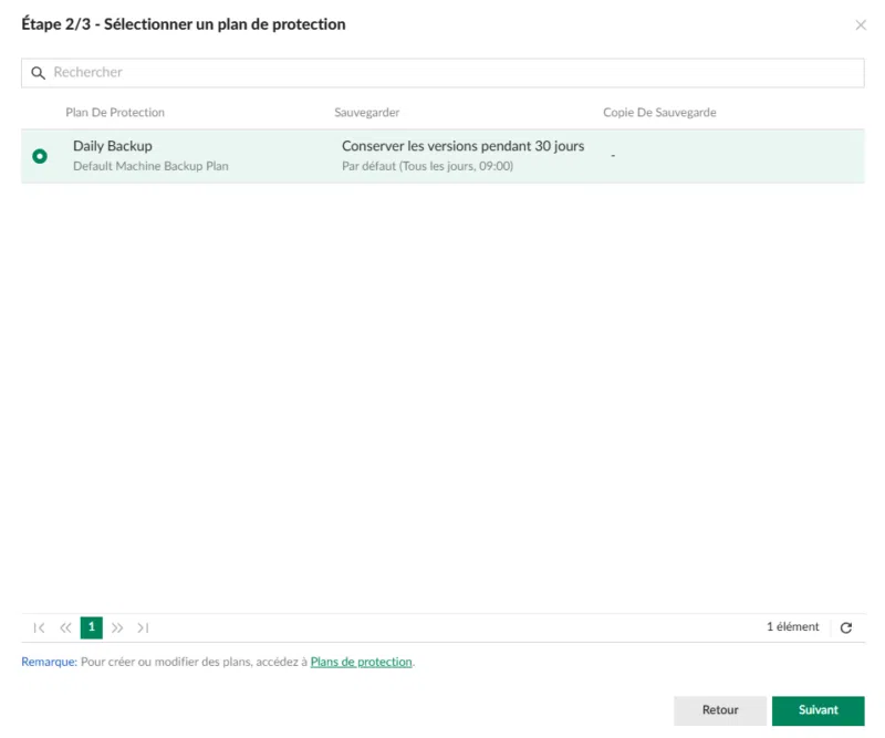 Un plan de protection doit être associé aux machines virtuelles précédemment sélectionnées. Il s'agit de la stratégie de sauvegarde à appliquer, notamment la durée de rétention et la fréquence d'exécution des sauvegardes.