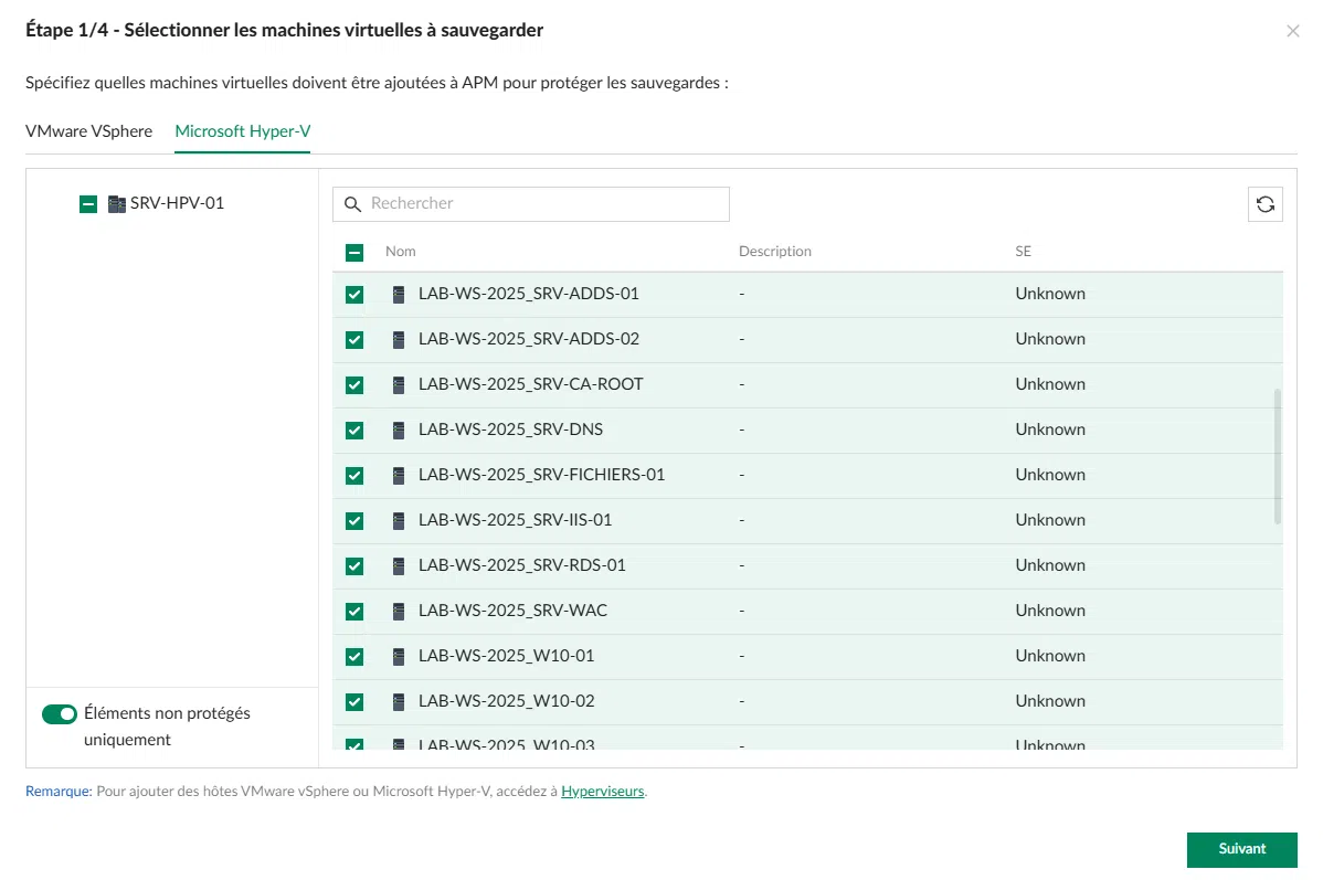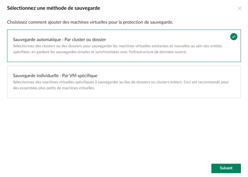 Vous pouvez sélectionner manuellement les machines virtuelles à sauvegarder ou demander à ActiveProtect de sauvegarder toutes les VM, y compris celles créées ultérieurement. Ce mode assure la protection automatique de vos machines virtuelles, sans nécessité de revoir la stratégie de sauvegarde à chaque fois.