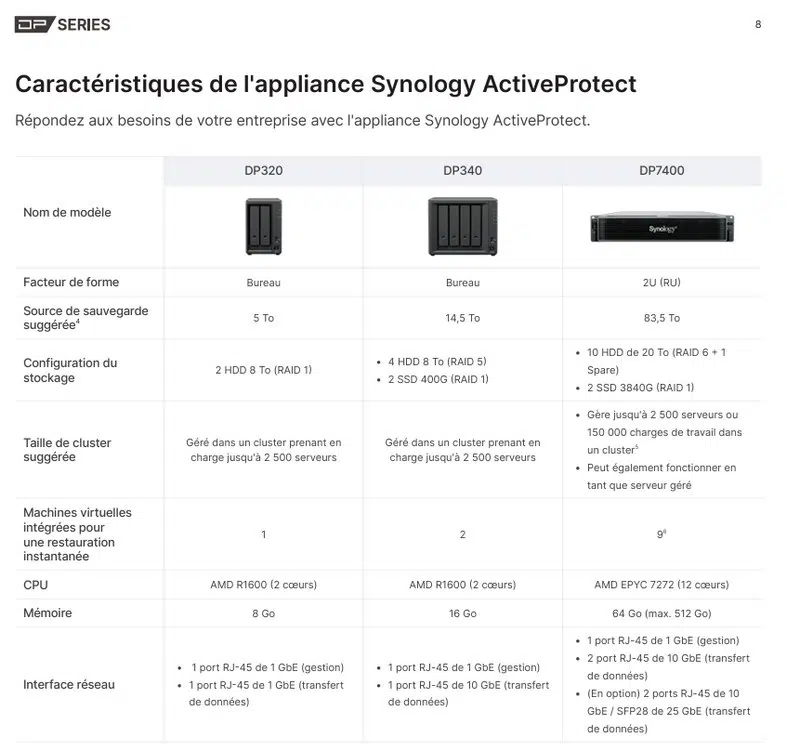 À ce jour, Synology propose trois modèles différents dans la gamme ActiveProtect lancée en 2025. Il y a le modèle 2 baies DP320 avec une capacité utile de 8 To présenté dans cet article, ainsi que deux autres modèles pour les entreprises plus exigeantes : DP340 et DP7400. L'appliance Synology DP320 est équipée d'un processeur AMD R1600 (2 coeurs) et de 8 Go de RAM.