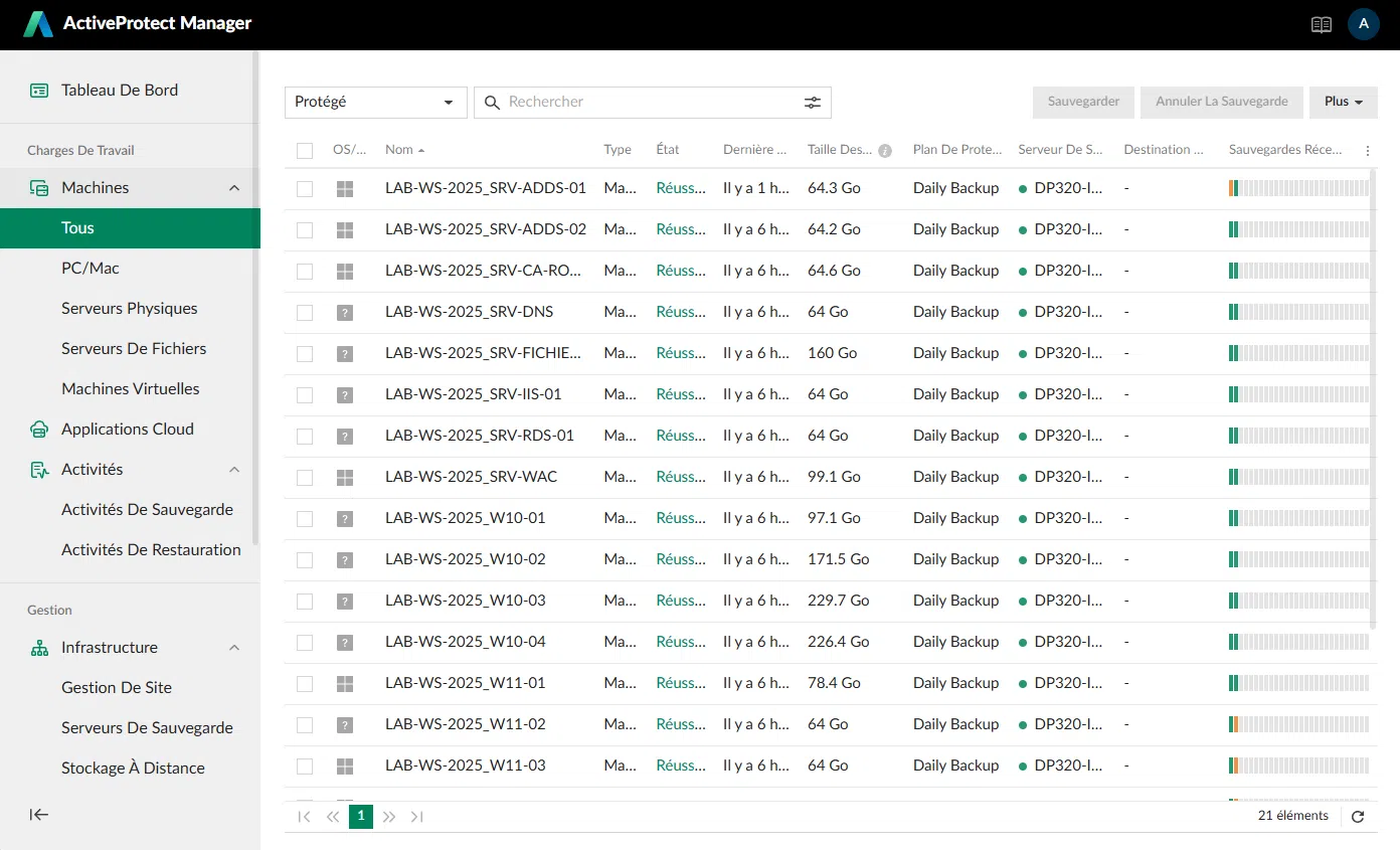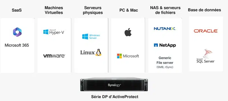 ActiveProtect Manager prend en charge la sauvegarde et la restauration de charges de travail variées, parmi lesquelles : ordinateurs sous Windows et Mac, serveurs de fichiers, serveurs physiques, machines virtuelles (Hyper-V et VMware) et les environnements Cloud basés sur Microsoft 365. Il y a bien des possibilités de sauvegarde pour les serveurs sous Linux.