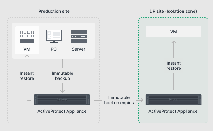 Ci-dessous, un exemple avec 2 appliances, dont une première sur le site de production et une seconde dans une zone isolée dédiée Disaster Recovery (plan de reprise d'activité). Le caractère immuable des sauvegardes effectué est important puisque cela signifie qu'il n'est pas possible de supprimer ces sauvegardes, y compris pour un administrateur (principe WORM).
