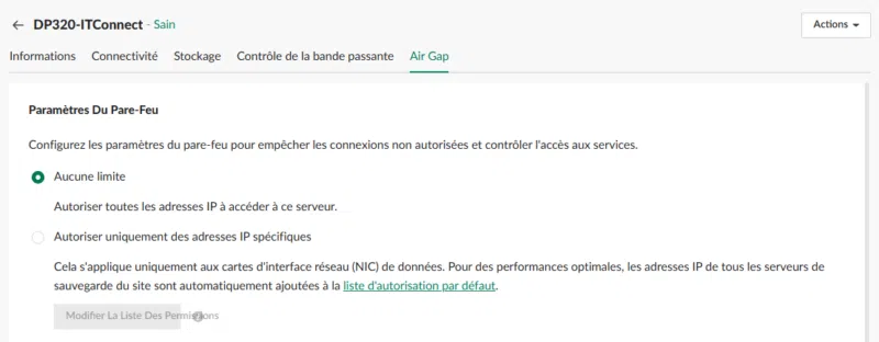 Dans la configuration, une section a particulièrement attiré mon attention : Air Gap. Dans le contexte des sauvegardes, le terme "air gap" désigne une séparation physique ou logique entre les données de production et leur copie de sauvegarde afin de prévenir tout accès non autorisé, notamment en cas de cyberattaque. Autrement dit, c'est comme si vous mettiez sous cloche l'appliance de sauvegarde pour empêcher tous les accès externes.
