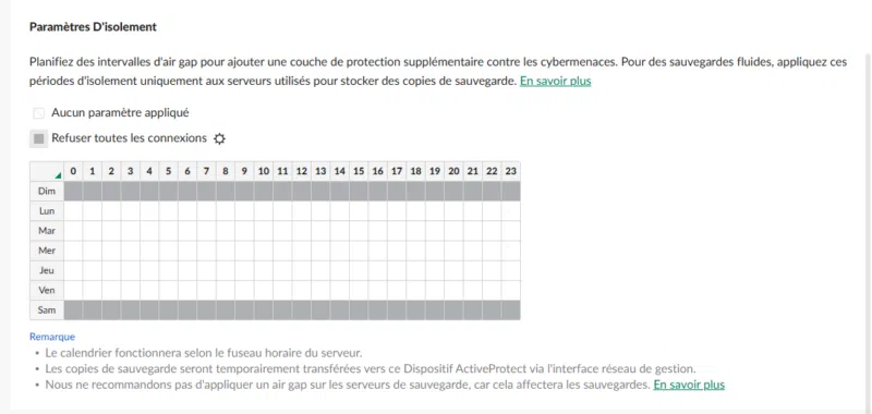 Le filtrage au niveau réseau est complété par les paramètres d'isolement. Vous pouvez déterminer des plages horaires pendant lesquels le système sera isolé, notamment au niveau du réseau de données. En tant qu'administrateur, vous gardez la main sur l'appliance via le réseau de gestion, mais si un attaquant parvient à compromettre votre hyperviseur Hyper-V via le réseau de données, il ne pourra pas accéder à l'appliance.