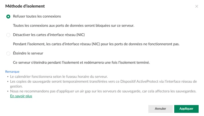Plusieurs méthodes d'isolement dans l'esprit "Air Gap" sont prises en charge, y compris la possibilité d'éteindre et démarrer automatiquement l'appliance pendant les phases d'isolement.
