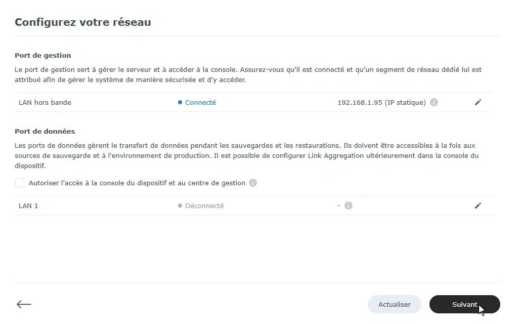Pour la mise en route, j'ai pris la décision de connecter uniquement le port réseau "Management" du boitier. Cette interface dédiée à l'administration n'a pas d'accès à Internet, pour des raisons de sécurité. De ce fait, le système d'exploitation doit être téléchargé sur le site de Synology puis chargé sur l'interface web lors de la configuration initiale.