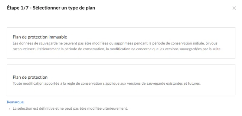 L'administrateur peut créer autant de plan de protection qu'il le souhaite et activer différentes options. Un plan de protection immuable va créer des sauvegardes immuables et appliquer la méthode WORM : Write Once Read Many, soit une seule écriture et plusieurs lectures.