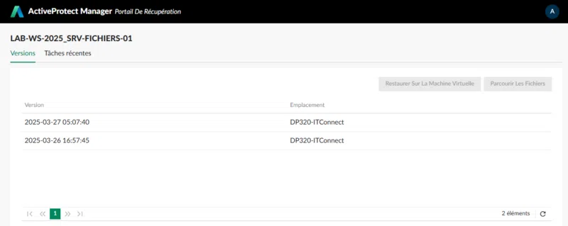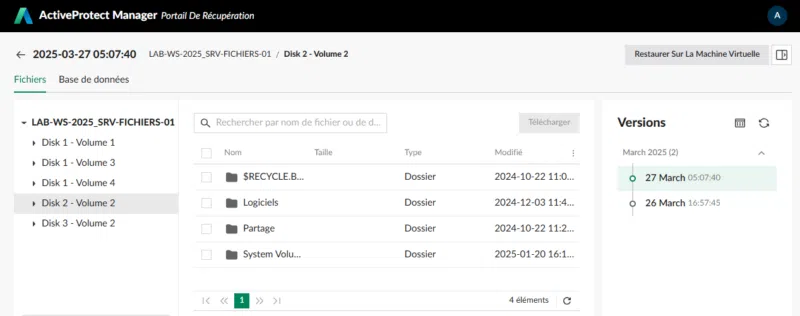 Un portail de récupération dédié, auquel vous pouvez déléguer l'accès de façon granulaire, vous offre la possibilité de parcourir les sauvegardes d'une ressource. L'opérateur peut naviguer entre les différentes versions de sauvegarde et prendre la décision de restaurer un fichier, plusieurs fichiers ou la ressource dans son intégralité.