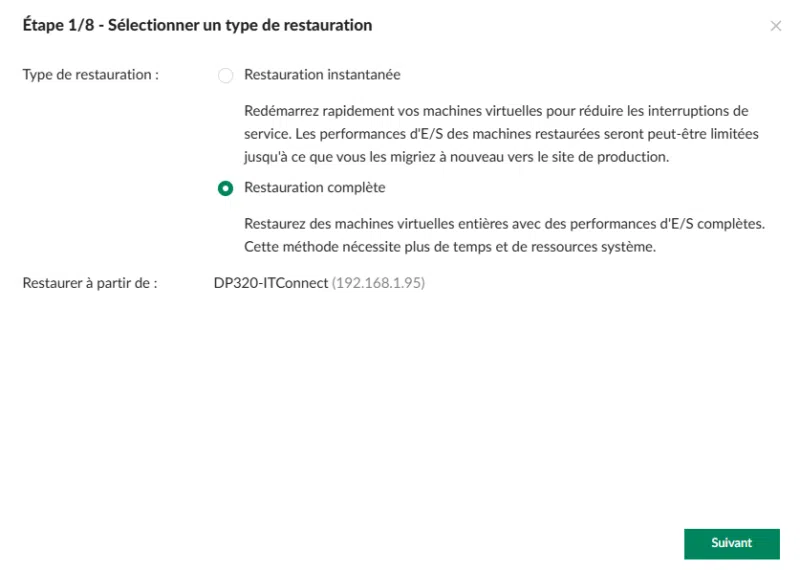 Prenons l'exemple d'une machine virtuelle. Deux modes de restauration sont proposés : restauration instantanée et restauration complète. Le premier mode sert à démarrer la machine virtuelle directement depuis le NAS, c'est-à-dire via le réseau, tandis que le second mode implique de restaurer la VM dans son intégralité sur un hyperviseur avant de la lancer.