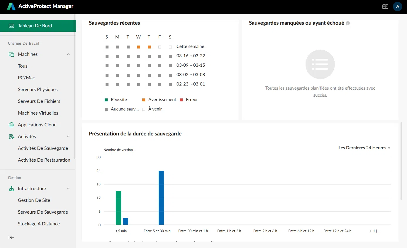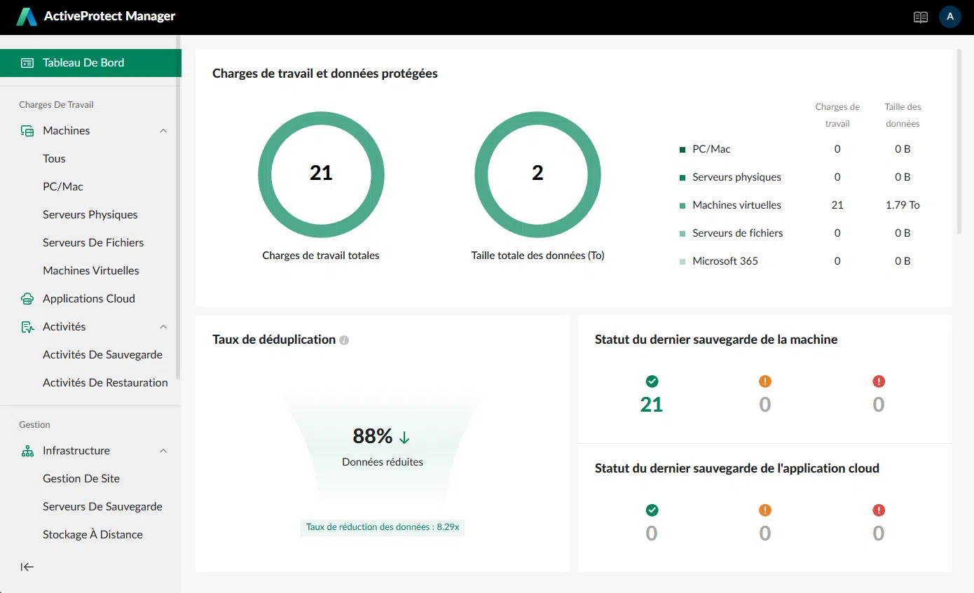 La console ActiveProtect Manager regroupe toutes les informations nécessaires pour suivre l'état des sauvegardes. Cela est accompagné par la possibilité de recevoir des notifications selon différents événements, ainsi que des statistiques d'utilisation du stockage.