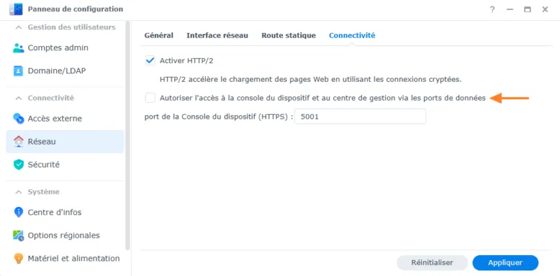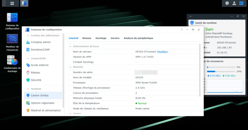 Les habitués de DSM relèverons quelques différences, comme cette option spécifique à cet OS. Elle sert à autoriser l'accès à l'interface de gestion de l'appliance depuis le réseau de données (connecté sur le port réseau correspondant). Sur DSM, cette option n'existe pas, et créer cette séparation entre le réseau de management et le réseau de données impliquent de le faire volontairement et de passer du temps à configurer le pare-feu. Avec ActiveProtect, cette protection est native et elle se gère avec une simple case à cocher.