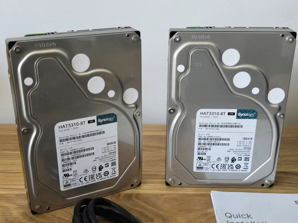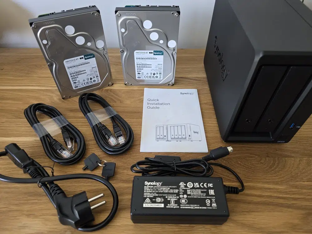 L'appliance Synology est accompagnée par deux câbles RJ45, une alimentation externe, deux clés pour verrouiller/déverrouiller les baies de disques et un guide d'installation rapide. Sans oublier la présence deux disques durs dans le carton : Synology HAT3310-8T (8 To). Quand vous commandez une appliance Synology DP320, vous recevez donc un package complet et vous n'avez pas à vous soucier de l'achat des disques. A contrario, vous n'avez pas le choix de la capacité de votre futur espace de stockage.