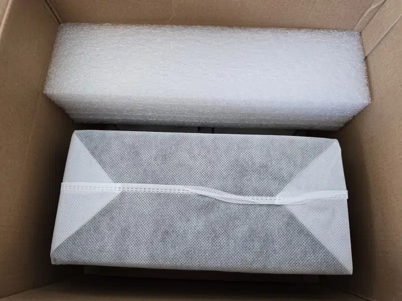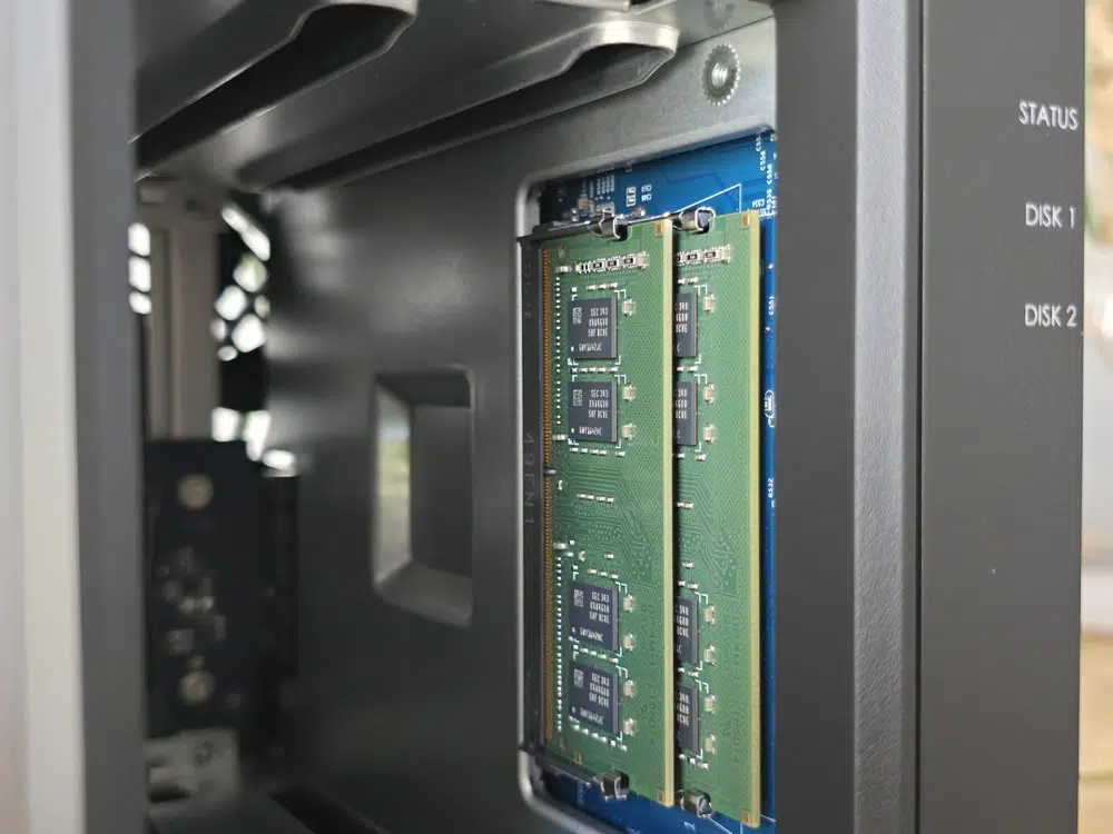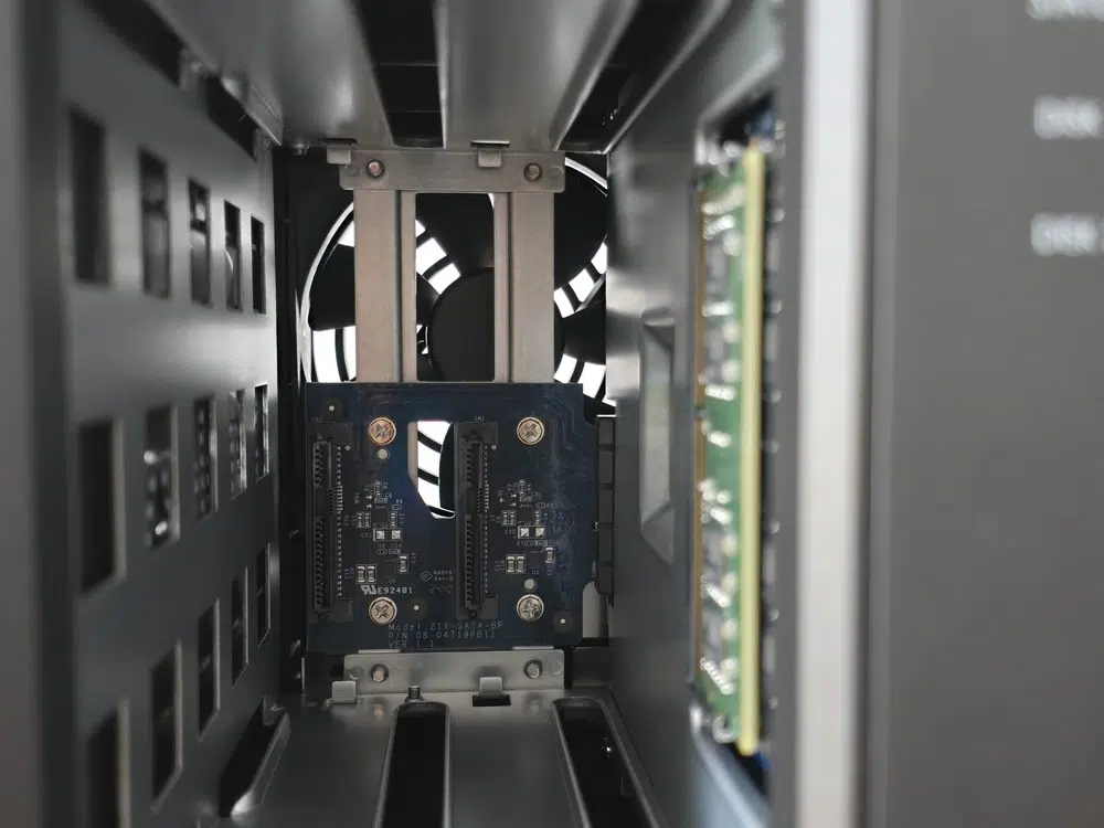 Les disques durs, protégés par des sachets anti-statiques, doivent être installés par vos soins. Il n'y a pas d'outil à prévoir puisque les racks en plastique sont à clipser de chaque côté du disque. Lorsque les baies de disque sont retirées, vous pouvez accéder aux deux slots de RAM, sur la droite.