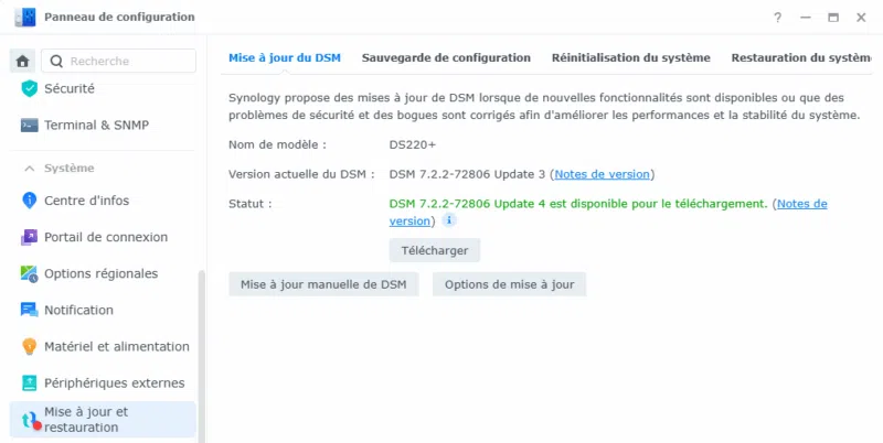Pour vérifier les mises à jour sur votre NAS, ouvrez le "Panneau de configuration", cliquez sur "Mise à jour et restauration" et vérifiez les mises à jour de DSM. Il est aussi envisageable d'effectuer une mise à jour manuelle après avoir récupéré le paquet d'installation sur le site de Synology.