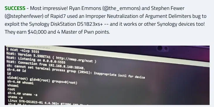 Lors de l'événement Pwn2Own 2024 qui s'est déroulé en Ireland du 22 au 25 octobre 2024, les équipes de « hackers » sont parvenues à découvrir des vulnérabilités dans les produits de plusieurs éditeurs et marques, dont Synology.