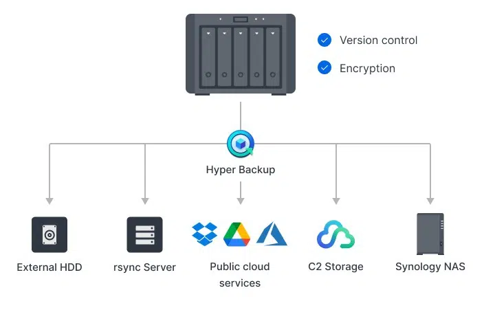 Pour répondre à ce besoin, Synology propose l’application Hyper Backup, qui permet de planifier et d’automatiser des sauvegardes vers différents emplacements : un autre NAS, un serveur distant, un service cloud (comme Synology C2, Amazon S3, Microsoft Azure, etc.), ou encore un disque dur externe connecté en USB au NAS. Grâce à Hyper Backup, accessible gratuitement et développée par Synology, il est envisageable de sauvegarder et restaurer ses données en cas d’incident.