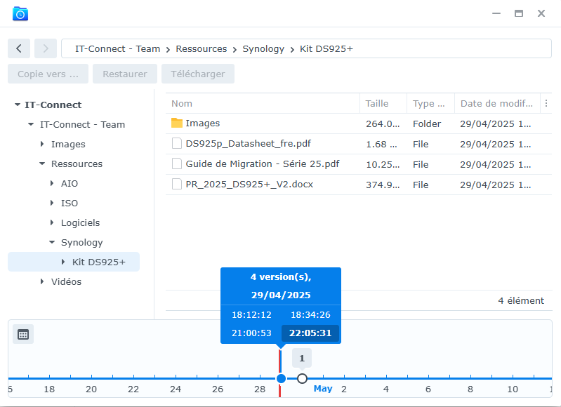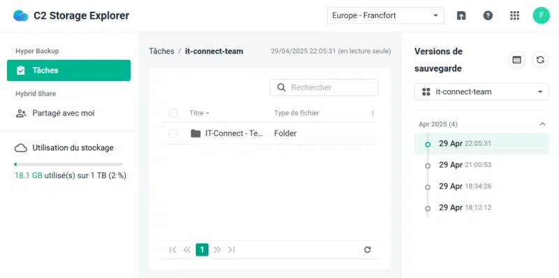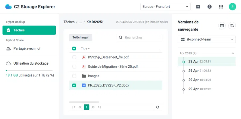 Quand vous passez par C2 Storage Explorer, c'est-à-dire sans passer par DSM, vous pouvez parcourir vos sauvegardes. Il n'est pas possible de restaurer un fichier directement via cette interface. Néanmoins, vous pouvez télécharger un élément si vous le souhaitez, mais le fichier sera téléchargé en local sur votre PC.