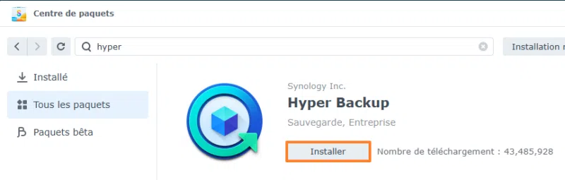 Commençons la prise en main d'Hyper Backup par une étape indispensable : l'installation du paquet à partir du Centre de paquets de DSM. Vous pourrez retrouver cette application facilement et l'installation d'un seul clic.