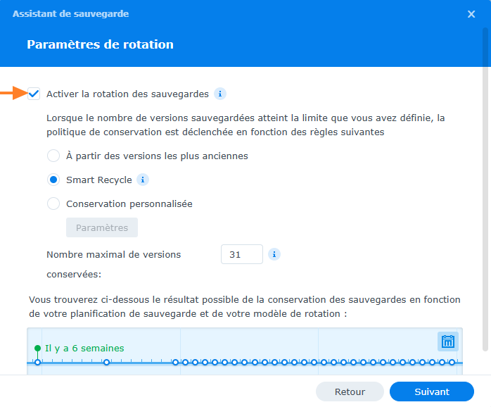 La dernière étape s'affiche à l'écran et celle-ci concerne les paramètres de rotation. Autrement dit, quelles sont les versions de sauvegarde que vous désirez conserver afin de définir la politique de rétention. Il est possible de créer une politique personnalisée ou de partir sur le mode Smart Recycle. Avec ce mode, vous conservez :