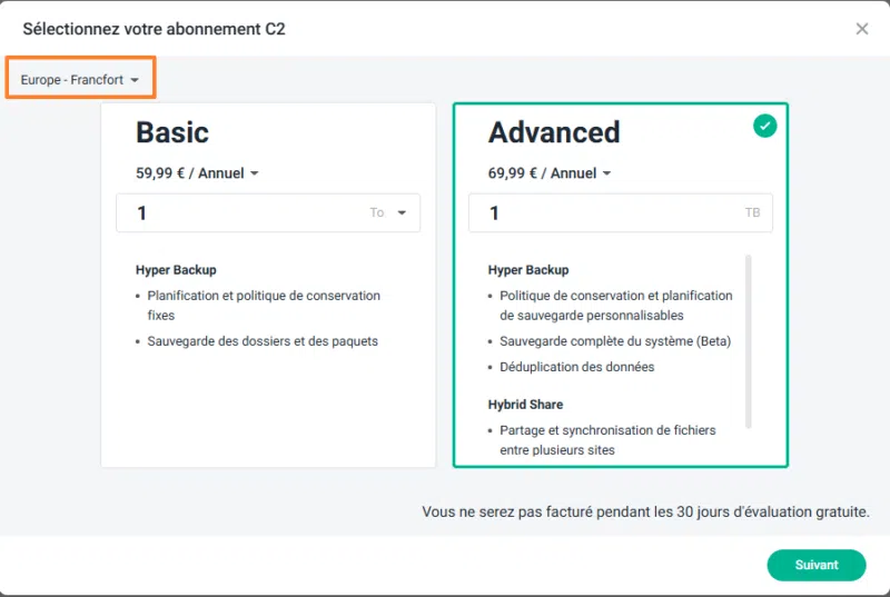 Après avoir sélectionné le Cloud C2, vous devez vous connecter avec votre compte Synology pour faire le lien avec le Cloud. Vous pouvez effectuer un essai gratuit du service pendant 30 jours. Veillez à sélectionner la région située en Europe.