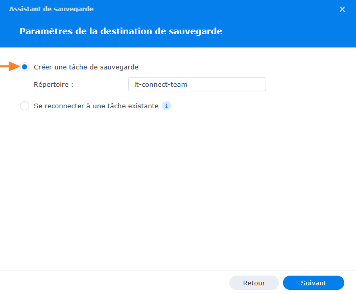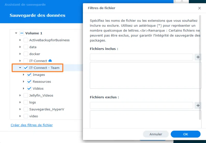 Ensuite, vous devez sélectionner les répertoires à sauvegarder. Dans ce cas, nous sélectionnons uniquement le répertoire nommé "IT-Connect - Team". Nous pourrions tout à fait cocher les répertoires correspondant à Synology Drive ou encore aux conteneurs Docker pour en effectuer une sauvegarde. C'est d'ailleurs ce que j'ai eu l'occasion de faire dans le cadre de mon déploiement personnel.