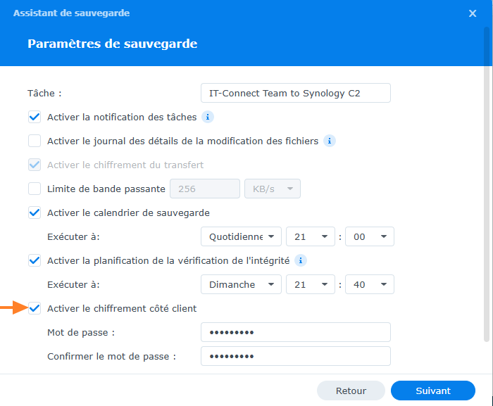 Puis, vous devez nommer la tâche et déterminer à quelle fréquence elle doit s'exécuter. Ici, nous partons sur une sauvegarde quotidienne exécutée à 21h00. L'intégrité des sauvegardes sera vérifiée une fois par semaine, le dimanche à 21h40. Les données stockées dans le Cloud C2 sont chiffrées, mais pour accroître la sécurité des données, je vous recommande de cocher l'option "Activer le chiffrement côté client". Mais, attention, si vous perdez le mot de passe, vous ne pourrez pas restaurer les données.