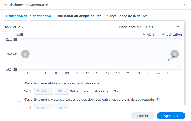 Les statistiques de sauvegarde permettent d'obtenir des détails sur l'activité de cette tâche : espace consommé dans la destination, avec la possibilité d'avoir des alertes, ainsi que des chiffres clés sur le nombre de fichiers ajoutés ou supprimés. L'option "M'avertir d'une croissance excessive des données entre les versions de sauvegarde", peut-être intéressante aussi pour être prévenu lorsqu'il y a un pic de changements dans les données à sauvegarder.