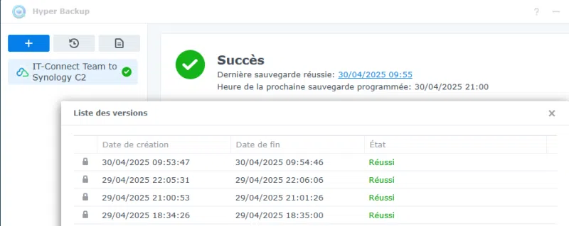 Le tableau de bord d'Hyper Backup, bien qu'élémentaire, donne un aperçu global sur l'ensemble de vos tâches de sauvegarde. Le dernier statut est visible facilement, tandis que la liste des versions donne un aperçu sur l'état des précédentes exécutions de la tâche. On pourrait considérer qu'il manque un tableau de bord plus évolué comme celui d'Active Backup for Business, notamment avec la vue calendaire.