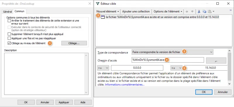 Si vous avez besoin de différencier Sysmon 32 bits et Sysmon 64, utilisez une règle de "Ciblage au niveau de l'élément" sur chaque règle de la GPO. Cette règle devra aller vérifier la présence de la clé de Registre "Sysmon" ou "Sysmon64" pour déterminer la version de l'application.