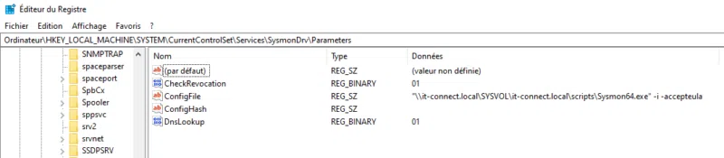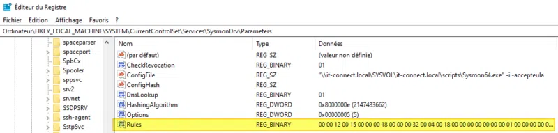 La configuration Sysmon est stockée dans la clé de Registre correspondante au pilote Sysmon : "SysmonDrv" (nom par défaut). Ceci correspond à cet emplacement du Registre :