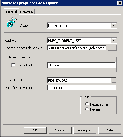 Lire cet articleI. Présentation Sur les postes clients liés à un domaine, il peut être utile de ne pas afficher les fichiers et dossiers cachés par défaut. Pour cela, l’utilisation des préférences s’impose car il n’y a pas de paramètres de stratégie spécifique pour masquer les fichiers cachés et les dossiers cachés. II. Procédure Accédez à la console de gestion des stratégies de groupe sur votre serveur Contrôleur de domaine, puis, créer une préférence pour le registre en accédant à « Préférences », « Paramètres Windows » et « Registre ». Clic droit dans la zone de droite puis « Nouveau » et « Élément Registre » La valeur existant déjà, nous allons la mettre à jour donc l’action sera « Mettre à jour » et la ruche c’est-à-dire l’arborescence à parcourir la suivante : HKEY_CURRENT_USER\Software\Microsoft\Windows\CurrentVersion\Explorer\Advanced\Hidden Nous ne changerons pas le nom mais uniquement la valeur qui doit avoir une donnée différente selon ce qu’on souhaite : – 0 : Afficher tous