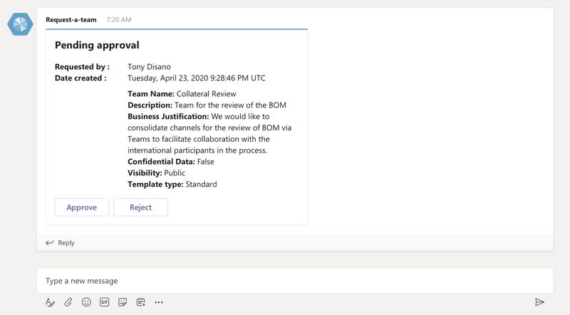 Lorsque la demande est soumise, une carte interactive est générée et envoyée dans Teams aux administrateurs. Deux boutons sont affichés afin d'accepter ou refuser la demande. Si la demande est acceptée, l'équipe sera créée en s'appuyant sur les paramètres indiqués par le demandeur. Plutôt appréciable, vous ne trouvez pas ?